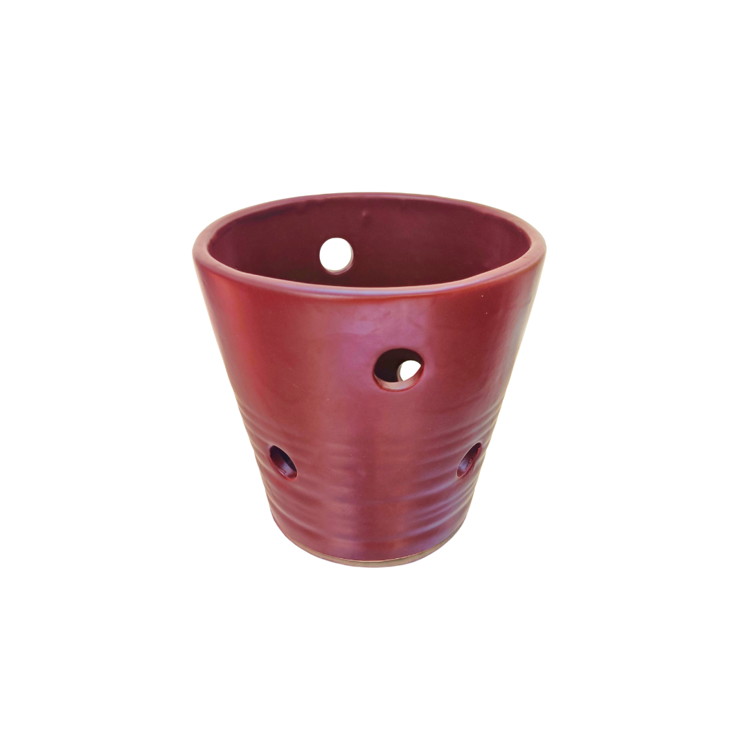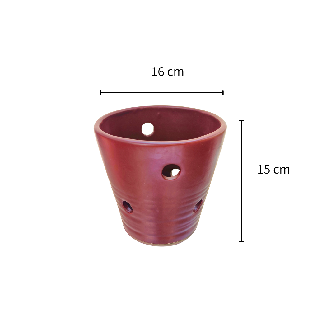 Maceta de cerámica esmaltada diseñada específicamente para orquídeas, con perforaciones estratégicas que garantizan el paso de luz y circulación de aire alrededor de las raíces. El esmalte cerámico proporciona durabilidad y facilita la limpieza, mientras que su estructura permite que el sustrato se seque adecuadamente entre riegos, previniendo la pudrición radicular. Ideal para cultivadores que buscan crear el ambiente perfecto para el desarrollo saludable de sus orquídeas.